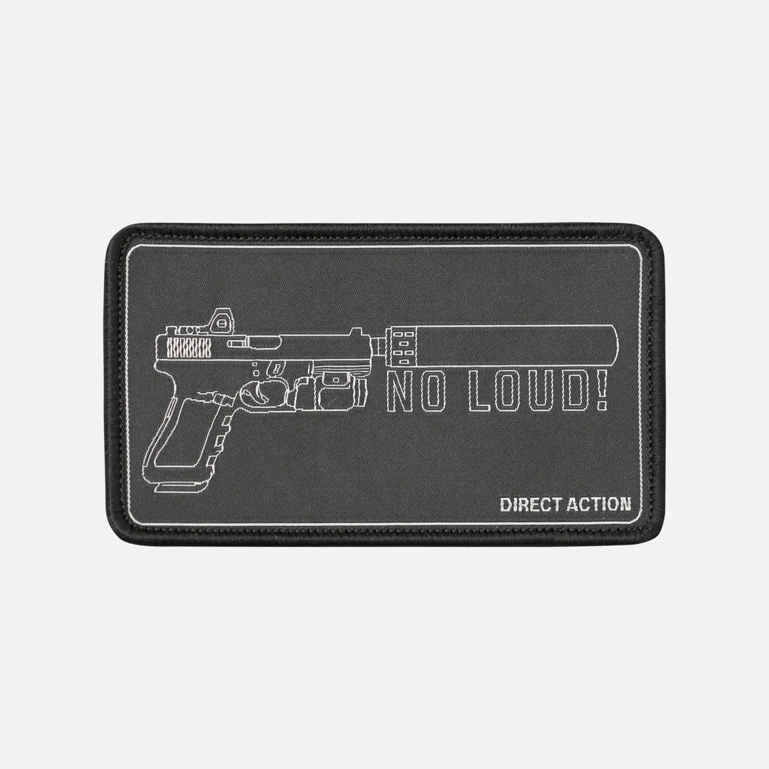 Нашивка с вышитым пистолетом с глушителем и девизом "Без шума!" на черном фоне. Нашивка также снабжена крючком и петлей для крепления к снаряжению или одежде.